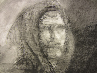 followed model around in 3 different positions with a drawing horse. focused on big movements and rhythms. The drawings would stiffen up, then I would wipe away. The other is a value study for upcoming painting, and the bottom-most is my bud aaron.